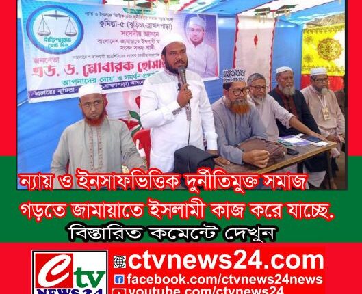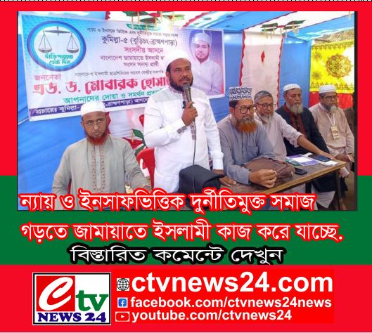 ন্যায় ও ইনসাফভিত্তিক দুর্নীতিমুক্ত সমাজ গড়তে জামায়াতে ইসলামী কাজ করে যাচ্ছে। যেখানে দুর্যোগ-দূর্ভোগ সেখানেই জামায়াতে ইসলামী সবার আগে কাজ করে। আল্লাহর জমিনে আল্লাহর আইন ইসলাম থাকবেই। যারা ইসলামের বিরুদ্ধে ষড়যন্ত্র করবে তারাই শেষ হয়ে যাবে। সেজন্য মানবিক সংগঠন বাংলাদেশ জামায়াতে ইসলামী বাংলাদেশকে একটি ইসলামী কল্যাণমূলক রাষ্ট্র গড়তে চায়। সেই লক্ষ্য জামায়াতে ইসলামী কাজ করে যাচ্ছে। (১৮ অক্টোবর) শনিবার সকালে কুমিল্লা জেলার ব্রাহ্মণপাড়া উপজেলায় বাংলাদেশ জামায়াতে ইসলামী মহিলা বিভাগের উদ্যোগে মোশাররফ হোসেন খান চৌধুরী বিশ্ববিদ্যালয় কলেজ মাঠে আয়োজিত নির্বাচনী সমাবেশে কুমিল্লা-৫ (বুড়িচং-ব্রাহ্মণপাড়া) আসনে জামায়াতে ইসলামীর মনোনীত প্রার্থী ও বুড়িচং-ব্রাহ্মণপাড়া উন্নয়ন ফোরামের চেয়ারম্যান ড. এডভোকেট মোবারক হোসাইন এই কথাগুলো বলেন। তিনি আরো বলেন, রাষ্ট্র পরিচালনার সুযোগ পেলে দুর্নীতিমুক্ত দেশ গড়ে তোলা হবে। ফ্যাসিস্ট হাসিনা দেশকে এককভাবে অন্যায় ও অবিচারের মাধ্যমে পরিচালনা করেছে। ভাতের এবং ভোটের অধিকার থেকে সাধারন মানুষকে বঞ্চিত করেছে। সেজন্য ছাত্র-জনতা ও জনগন ঐক্যবদ্ধভাবে এই ফ্যাসিস্ট হাসিনাকে বিদায় করেছে। আর যেনো কেউ ফ্যাসিস্ট হতে না পারে সেদিকে সকলকে লক্ষ্য রাখতে হবে। সমাবেশে মহিলা বিভাগের সাফিয়া খাতুন এর সভাপতিত্বে প্রধান অতিথি হিসাবে উপস্থিত ছিলেন বাংলাদেশ জামায়াতে ইসলামীর মহিলা বিভাগের সহকারি সেক্রেটারি মুহতারামা সাঈদা রুম্মান। প্রধান বক্তা হিসাবে উপস্থিত ছিলেন কুমিল্লা মহানগরী সেক্রেটারি শাহিন আক্তার। বিশেষ অতিথি হিসাবে উপস্থিত ছিলেন কুমিল্লা উত্তর জেলা সেক্রেটারি ফেরদৌসি আক্তার, সহকারি সেক্রেটারি ইয়াসমিন ফেরদৌসি, সহকারি সেক্রেটারি জান্নাতুল মেওয়া। এছাড়া আরো উপস্থিত ছিলেন ব্রাহ্মণপাড়া উপজেলা জামায়াতে ইসলামীর আমীর মাওলানা রেজাউল করিম, সাবেক ভাইস চেয়ারম্যান মাওলানা মিজানুর রহমান আতিকী, (কুমিল্লা-৫) নির্বাচনী সমন্বয়কারী অধ্যাপক আবদুল আউয়াল, সহকারি সেক্রেটারি জেনারেল মাওলানা রফিকুল ইসলাম ভূইঁয়াসহ জামায়াতে ইসলামীর বিভিন্ন পর্য্যায়ের নের্তৃবৃন্দরা। সংবাদ প্রকাশঃ ১৯-১০-২০২৫ ইং সিটিভি নিউজ এর (সংবাদটি গুরুত্বপূর্ণ মনে হলে দয়া করে ফেসবুকে লাইক বা শেয়ার করুন) (If you think the news is important, please share it on Facebook or the like> See More =আরো বিস্তারিত জানতে কমেন্টসে লিংকে ছবিতে ক্লিক করুন= ==আরো =বিস্তারিত জানতে কমেন্টসে নিউজ লিংকে ক্লিক করুন=