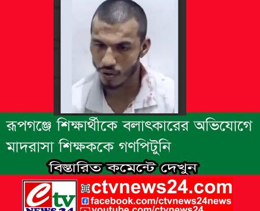 সিটিভি নিউজ, এম আর কামাল, নিজস্ব প্রতিবেদক,নারায়ণগঞ্জ : নারায়ণগঞ্জের রূপগঞ্জে মাদরাসা শিক্ষার্থীকে বলাৎকারের অভিযোগে মোহাম্মদ হোসেন (২৪) নামে এক শিক্ষককে গণপিটুনি দিয়ে পুলিশের সোপর্দ করেছে এলাকাবাসী।