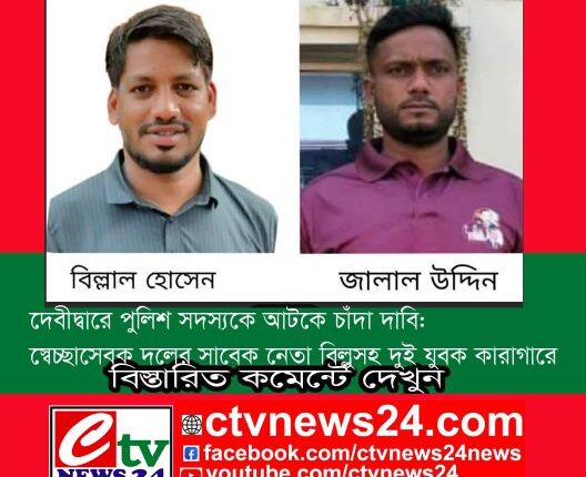 কুমিল্লার দেবীদ্বারে পুলিশ সদস্যকে আটকে রেখে ২ লাখ টাকা চাঁদা দাবির মামলায় দেবীদ্বার পৌর স্বেচ্ছাসেবক দলের সাবেক সাংগঠনিক সম্পাদক বিল্লাল হোসেন বিল্লু (৩০) ও তার সহযোগী জালাল উদ্দিন (৩২) কে কারাগারে পাঠানো হয়েছে।