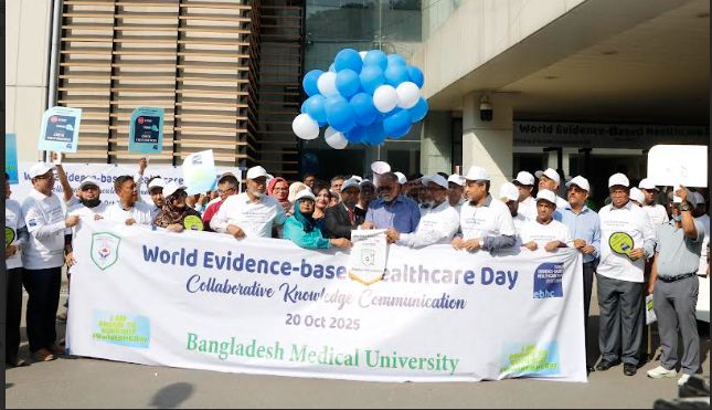 অক্সফোর্ড বিশ্ববিদ্যালয়ের সহায়তায় বাংলাদেশ মেডিক্যাল বিশ্ববিদ্যালয় (বিএমইউ) এর উদ্যোগে প্রথমবারের মতো র্যালি, আলোচনা সভা, সেমিনার, ই-পোস্টার প্রেজেস্টেশন, বৈজ্ঞানিক প্রবন্ধ উপস্থাপন, বির্তক অনুষ্ঠানসহ নানা আয়োজনে আজ সোমবার ২০ অক্টোবর ২০২৫ইং তারিখে ওয়ার্ল্ড ইভিডেন্স-বেইসড হেলথকেয়ার ডে ২০২৫ উদযাপিত হয়েছে। এ সকল আয়োজনে বিজ্ঞ বক্তারা প্রমাণভিত্তিক চিকিৎসাবিদ্যার চর্চাকে উৎসাহিত করার মাধ্যমে রোগীদের অধিকার নিশ্চিত করাসহ স্বাস্থ্যসেবাখাতে গুণগত পরিবর্তনের উপর গুরুত্বারোপ করেন। বিশেষ করে প্রমাণভিত্তিক চিকিৎসাবিদ্যার চর্চাকে উৎসাহিত করে চিকিৎসা ব্যয় কমানো, বিজ্ঞানভিত্তিক সঠিক চিকিৎসাসেবা প্রদান নিশ্চিত করা, চিকিৎসাসেবা, চিকিৎসা শিক্ষা ও গবেষণায় গুণগত মানবৃদ্ধির মাধ্যমে সামগ্রিক স্বাস্থ্যখাতের উন্নয়নে বড় ধরণের পরিবর্তন সাধন সম্ভব বলে বিজ্ঞজেনারা আশাবাদ ব্যক্ত করেন। গবেষণা, চিকিৎসাসেবা ও শিক্ষা কার্যক্রমের প্রতিটি স্তরে যদি প্রমাণভিত্তিক সিদ্ধান্ত গ্রহণ কার্যকর করা যায়, তবে একটি ন্যায্য ও দক্ষ স্বাস্থ্যব্যবস্থা গড়ে তোলা সম্ভব হবে, যা জনগণের আস্থা আরও সুদৃঢ় করবে। বাংলাদেশ মেডিক্যাল বিশ্ববিদ্যালয় আশা প্রকাশ করেছে যে, এই উদ্যোগ দেশের স্বাস্থ্যখাতে গুণগত পরিবর্তনের নতুন দিগন্ত উন্মোচন করবে। এবারে দিবসটির মূল থিম ছিল ‘কোলাবেরেটিভ নলেজ কমিউনিকেশন-রিফ্লেক্টস দি ভেরি ইসেন্স অফ মর্ডান হেলথকেয়ার এন্ড এডুকেশন: কোলাবেরেটিভ, ইনক্লুসিভ এন্ড বিল্ট অন টাস্ট’।