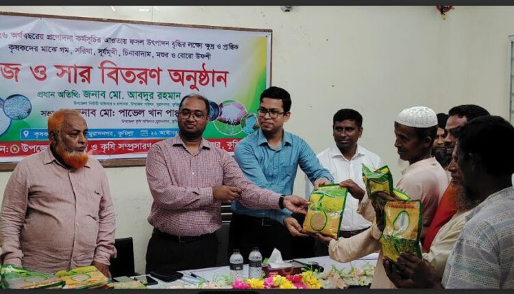কুমিল্লার মুরাদনগরে ফসল উৎপাদন বৃদ্ধি ও কৃষকদের উৎসাহিত করার লক্ষ্যে প্রান্তিক কৃষকদের মাঝে সরকারি প্রণোদনা হিসেবে সার ও বীজ বিতরণ করেছে উপজেলা প্রশাসন ও কৃষি সম্প্রসারণ অধিদপ্তর।