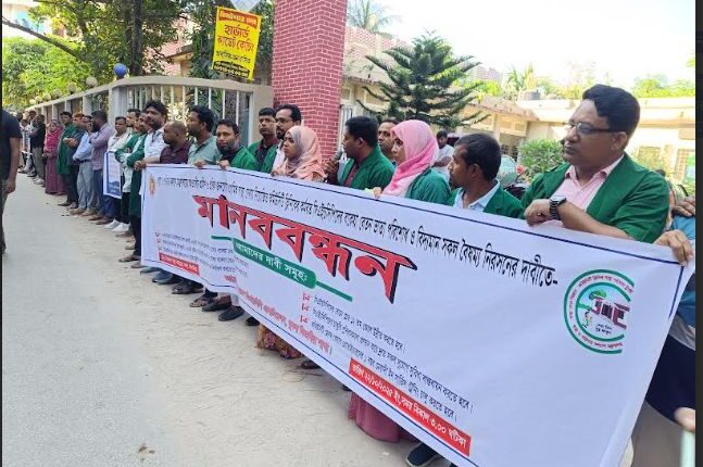 বকেয়া বেতন পরিশোধ, ১২তম গ্রেডে উন্নীতকরণ, চাকুরী প্রবিধানমালা প্রণয়নসহ ৮ দফা দাবীতে ঝিনাইদহে মানববন্ধন কর্মসূচী পালন করেছে খুলনা বিভাগের কমিউনিটি হেলথ কেয়ার প্রভাইডাররা।