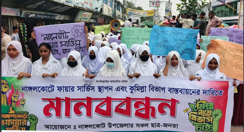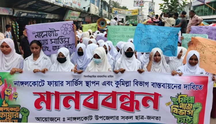 নাঙ্গলকোটে ফায়ার সার্ভিস স্থাপন ও কুমিল্লা বিভাগ ঘোষণার দাবিতে মানববন্ধন