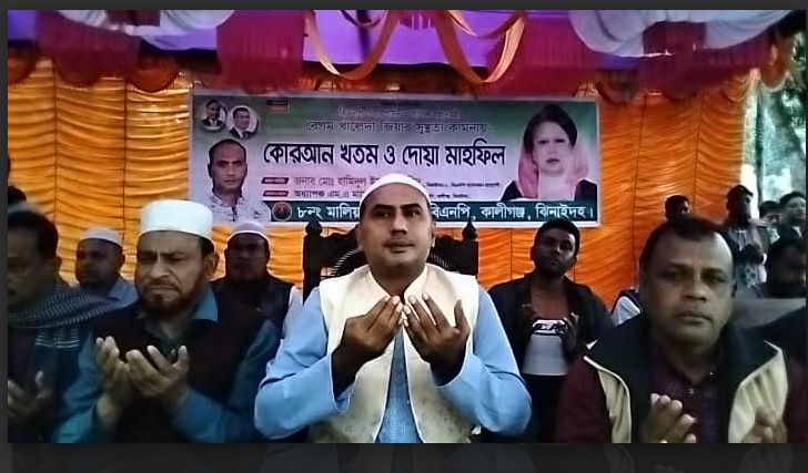 ঝিনাইদহের কালীগঞ্জে বিএনপির চেয়ারপারসন ও সাবেক প্রধানমন্ত্রী দেশনেত্রী বেগম খালেদা জিয়ার দ্রুত সুস্থতা কামনায় পবিত্র কোরআন খতম ও দোয়া মাহফিল অনুষ্ঠিত হয়েছে। শনিবার বিকাল ৪টায় উপজেলার তত্বিপুর বাজারে মালিয়াট ইউনিয়ন বিএনপির উদ্যোগে এই মাহফিলের আয়োজন করা হয়।দোয়া মাহফিলের আগে অনুষ্ঠিত আলোচনা সভার প্রধান অতিথি ছিলেন—