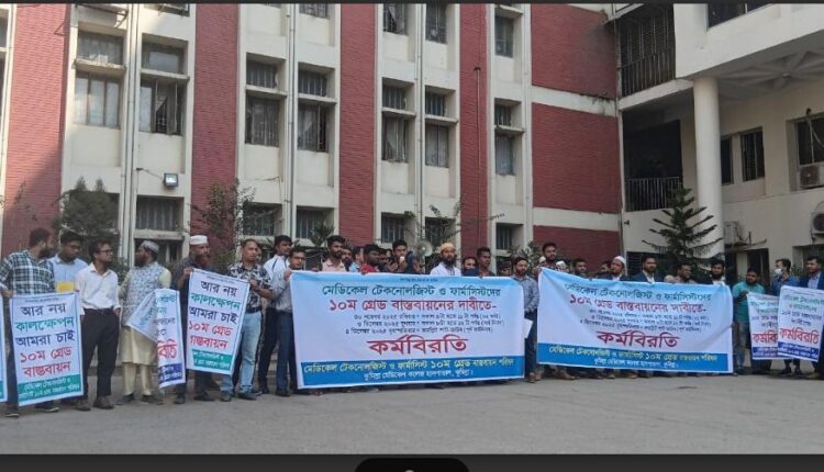 ১০ম গ্রেড বাস্তবায়নের লক্ষে কুমিল্লায় মেডিকেল টেকনোলজিস্ট ও ফার্মাসিস্টদের মানববন্ধন