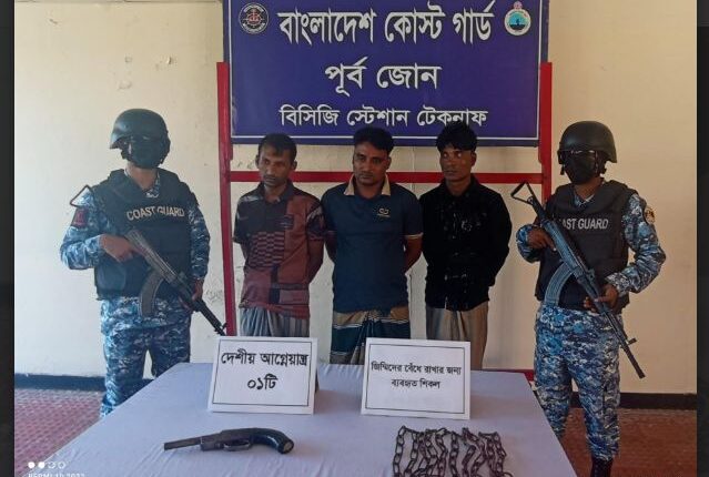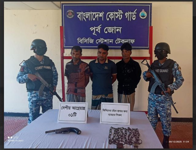 কক্সবাজার টেকনাফের বাহারছড়ার মারিশবুনিয়া সংলগ্ন গহিন পাহাড়ি এলাকায় বাংলাদেশ কোস্ট গার্ডের বিশেষ অভিযানে দেশীয় আ=গ্নেয়া=স্ত্রসহ ৩ জন মানব পাচা=রকারীকে আটক করা হয়েছে। এসময় মালয়েশিয়ায় পাচারের উদ্দেশ্যে ব=ন্দি থাকা নারী ও শিশুসহ ৭ জন ভুক্তভোগীকে উদ্ধার করা হয়।