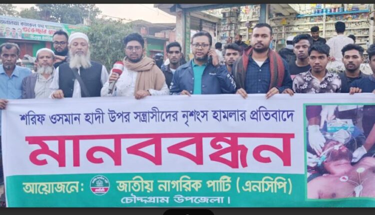 হাদীর উপর হামলাকারী সন্ত্রাসীদের গ্রেফতারের দাবীতে চৌদ্দগ্রামে এনসিপি’র মানববন্ধন