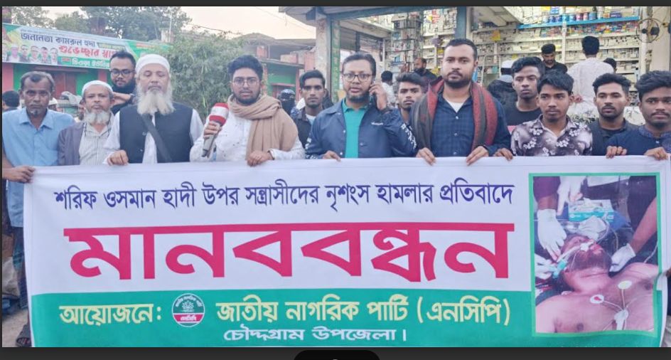 সিটিভি নিউজ।। মনোয়ারে হোসেন, কুমিল্লা সংবাদদাতা : ইনকিলাব মঞ্চের মুখপাত্র ও ঢাকা-৮ আসনের স্বতন্ত্র সংসদ সদস্য প্রার্থী শরীফ ওসমান বিন হাদীর উপর নৃশংস হামলার ঘটনার প্রতিবাদে এবং হামলাকারীদের অবিলম্বে গ্রেফতার ও দৃষ্টান্তমূলক শাস্তির দাবিতে সারাদেশের ন্যায় কুমিল্লার চৌদ্দগ্রামে উপজেলা এনসিপি’র উদ্যোগে মানববন্ধন ও বিক্ষোভ মিছিল অনুষ্ঠিত হয়েছে।