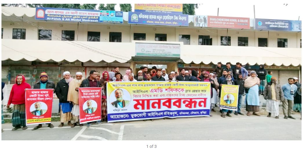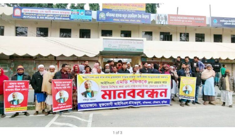কুমিল্লায় আইসিএল এমডি শফিককে গ্রেপ্তার ও গ্রাহকদের টাকা ফেরতের দাবিতে মানববন্ধন ও বিক্ষোভ