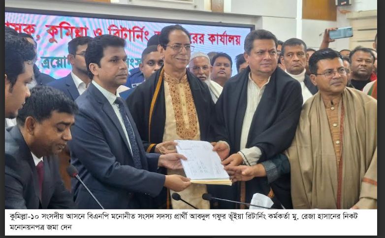 কুমিল্লা-১০ (নাঙ্গলকোট-লালমাই) সংসদীয় আসনে বিএনপি মনোনীত প্রাথী আবদুল গফুর ভূঁইয়া গতকাল সোমবার দুপুরে রিটার্নিং অফিসার ও কুমিল্লা জেলা প্রশাসক মু.রেজা হাসানের নিকট জমা দলীয় মনোনয়নপত্র জমা দিয়েছেন।