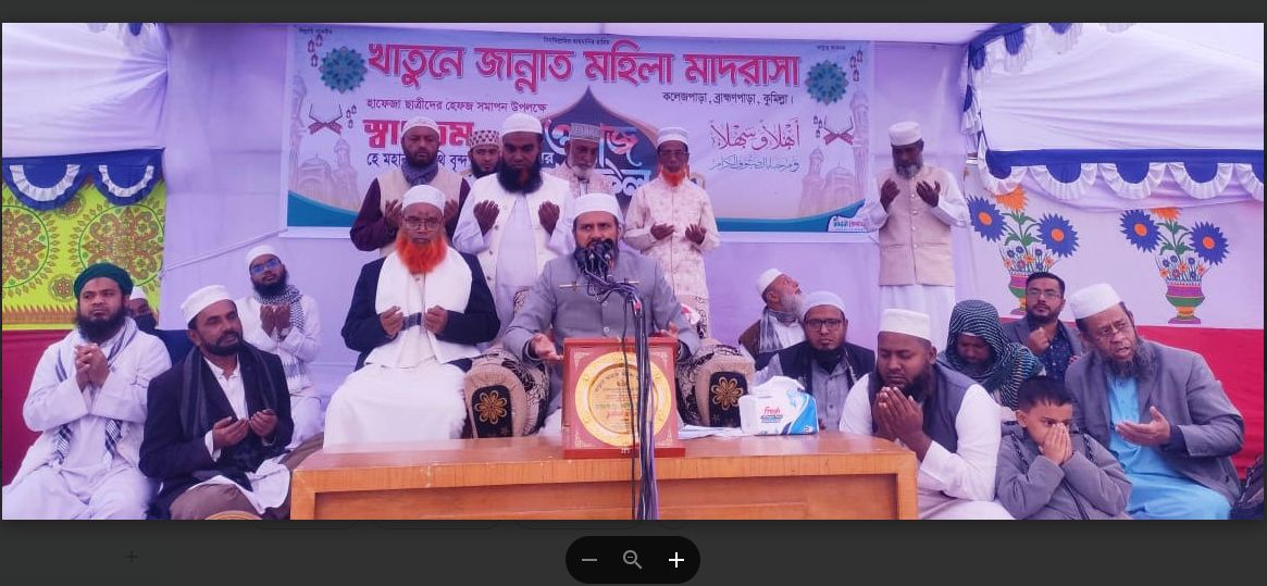 ‎কুমিল্লা জেলার ব্রাহ্মণপাড়া উপজেলার সদরের কলেজপাড়ায় অবস্থিত দ্বীনি শিক্ষা প্রতিষ্ঠান “খাতুনে জান্নাত মহিলা মাদ্রাসায়” হাফেজা ছাত্রীদের হেফজ সম্পন্ন উপলক্ষে ওয়াজ ও দোয়ার মাহফিল অনুষ্ঠিত হয়েছে। বুধবার (৩১ ডিসেম্বর) সকাল ১০টা থেকে শুরু করে বিকাল ৪টা পর্যন্ত মাদ্রাসা মাঠ প্রাঙ্গনে এই ওয়াজ ও দোয়ার মাহফিল অনুষ্ঠিত হয়। এবছর এই মাদ্রাসা থেকে ৮ জন হাফেজা ছাত্রী হেফজ সম্পন্ন করে। তারা হলেন- হাফেজা লাবিবা আক্তার (৩ মাসে) হাফেজা নুসরাত জাহান (৪ মাসে) হাফেজা নওশীদ জামাল (৭ মাসে) হাফেজা নুর জাহান (১০ মাসে) হাফেজা সাদিয়া (১৭ মাসে) হাফেজা সুমাইয়া আক্তার (১৪ মাসে) হাফেজা শাহরিল ইসলাম নাবিহা (৩০ মাসে) হাফেজা সুমাইয়া আক্তার মিথিলা (১৯ মাসে)। তাদেরকে সম্মাননা স্মারক ক্রেস্ট ও বোরকা প্রদান করা হয়। এছাড়াও মাদ্রাসার প্রতিষ্ঠাতা ও পরিচালক হাফেজ মুহাম্মদ জসিম ইসলামকে মাদ্রাসার পক্ষ থেকে ক্রেস্ট দিয়ে সম্মাননা করা হয়। এতে মাদ্রাসার সভাপতি মো. মোসলেহ উদ্দিন এর সভাপতিত্বে ও মাদ্রাসার প্রতিষ্ঠাতা ও পরিচালক হাফেজ মুহাম্মদ জসিম ইসলাম এর সার্বিক তত্ত্বাবধানে প্রধান অতিথি হিসাবে উপস্থিত ছিলেন বারেশ্বর দরবার শরীফের পীর সৈয়দ মাওলানা মিজানুর রহমান। প্রধান বক্তা হিসাবে ওয়াজ পেশ করেন নাগাইশ দরবার শরীফের পীর অধ্যক্ষ মাওলানা মোস্তাক ফয়েজী। ওয়াজ পেশ করেন মাওলানা আওলাদ হোসেন মুরাদী, মাওলানা মাসুম বিল্লাহ বাশারী। সবশেষে মাদ্রাসার সাফল্যে কামনায় বিশেষ দোয়া ও মোনাজাত করেন অধ্যক্ষ মাওলানা মোস্তাক ফয়েজী। অত্র মাদ্রাসায় ভর্তি চলছে। যোগাযোগ- ০১৬২৬-৩২০৩৩৩. সংবাদ প্রকাশঃ ৩১-১২-২০২৫ ইং সিটিভি নিউজ এর (সংবাদটি গুরুত্বপূর্ণ মনে হলে দয়া করে ফেসবুকে লাইক বা শেয়ার করুন) (If you think the news is important, please share it on Facebook or the like> See More =আরো বিস্তারিত জানতে কমেন্টসে লিংকে ছবিতে ক্লিক করুন= ==আরো =বিস্তারিত জানতে কমেন্টসে নিউজ লিংকে ক্লিক করুন=