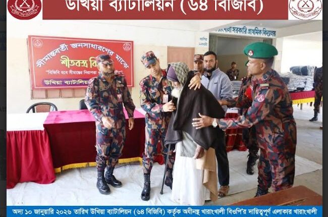 কক্সবাজারের উখিয়ায় মানবিক উদ্যোগের অংশ হিসেবে শীতার্ত, গরীব ও দুঃস্থ মানুষের মাঝে শীতবস্ত্র বিতরণ করেছে বর্ডার গার্ড বাংলাদেশ (বিজিবি)। শনিবার (১০ জানুয়ারি) সকালে উখিয়া ব্যাটালিয়ন (৬৪ বিজিবি)-এর উদ্যোগে এ কর্মসূচি বাস্তবায়ন করা হয়।