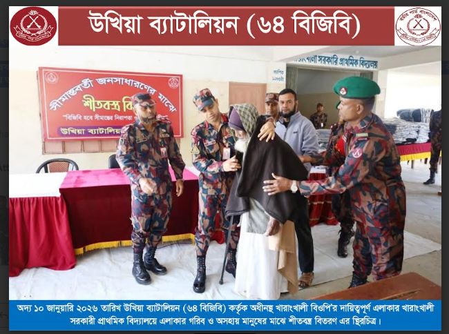 সকাল সাড়ে ৯টা থেকে সাড়ে ১০টা পর্যন্ত উখিয়া ব্যাটালিয়নের অধীন খারাংখালী বিওপি’র দায়িত্বপূর্ণ এলাকার খারাংখালী সরকারি প্রাথমিক বিদ্যালয় প্রাঙ্গণে মোট ৩০০ জন শীতার্ত মানুষের মাঝে শীতবস্ত্র বিতরণ করা হয়।