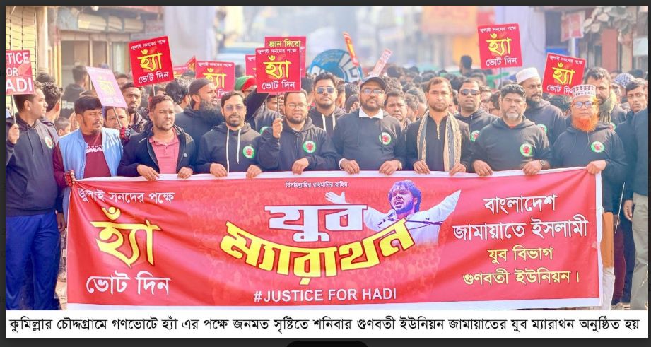 কুমিল্লার চৌদ্দগ্রামে আগামী ১২ ফেব্রুয়ারী গণভোটে ‘হ্যাঁ’ এর পক্ষে জনমত সৃষ্টিতে বিশাল যুব ম্যারাথন করেছে গুণবতী ইউনিয়ন জামায়াত। শনিবার সকালে গুণবতী বাজার থেকে শুরু করে খাটরা, বুধড়া ও কৈতরা হয়ে আবার গুণবতী গিয়ে শেষ হয়। যুব ম্যারাথনে অংশ নেন জামায়াত সমর্থিত শত শত যুবক। ম্যারাথনে অংশগ্রহণকারীরা হ্যাঁ ভোটের পক্ষে এবং শহীদ শরীফ ওসমান হাদীর হত্যার বিচার দাবিতে বিভিন্ন স্লোগান দেন। এতে নেতৃত্ব দেন ঢাকা মহানগর দক্ষিণ জামায়াতের মজলিশে শূরা সদস্য আইয়ুব আলী ফরায়েজী। এ সময় অন্যান্যের মধ্যে উপস্থিত ছিলেন জামায়াতের গুণবতী ইউনিয়ন নির্বাচন পরিচালনা কমিটির প্রধান আ.ন.ম মেশকাত উদ্দিন সেলিম, গুণবতী ইউনিয়ন আমীর ইউসুফ মেম্বার, চৌদ্দগ্রাম উপজেলা কর্মপরিষদ সদস্য ডাঃ মঞ্জুর আহমেদ সাকি, সাবেক ছাত্রনেতা আবু সাইয়িদ মজুমদার, জাফর আমেদ শিপন, শাহাদাত হোসেন, গুণবতী ইউনিয়ন জামায়াতের সেক্রেটারি ইকবাল হোসেন লিটন, সহ-সেক্রেটারি আবদুল হামিদ প্রমুখ।