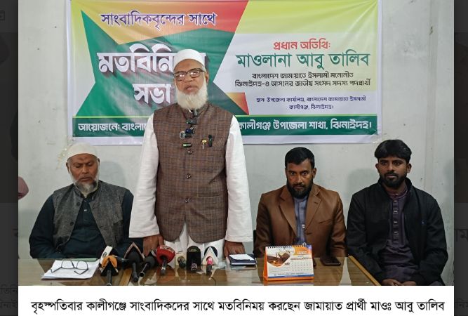 জামায়াতে ইসলামীর মনোনিত প্রার্থী মাওলানা আবু তালিব বলেন, সাংবাদিকরা জাতির বিবেক। বাংলাদেশের ইতিহাসে ৫৪ বছর পার হয়েছে। এ সময়ে মানুষের ভোটাধিকার হরণ করা হয়েছে, মানুষ বিভিন্ন ভাবে বঞ্চিত। ভোট আসলে মানুষের মধ্যে আতঙ্ক তৈরি করা হয়, ভয় দেখানো হয়। ভোট শেষ হলে যারা পরাজিত হয় তাদের বাড়িঘর ভাঙচুর করা হয়। এবারের নির্বাচন একটু ভিন্ন আঙ্গীকে দেখা হচ্ছে। নির্বাচনে সবার জন্য লেভেল প্লেয়িং ফিল্ড তৈরি হবে। স্বাধীনভাবে সবাই তার মতামত প্রয়োগ করতে পারবে। ভোটের সুন্দর পরিবেশ হবে এটা আমাদের প্রত্যাশা। এ সুন্দর পরিবেশের জন্য সাংবাদিকদের ভূমিকা রয়েছে। সেই প্রত্যাশা পুরনের জন্য সাংবাদিকদের ভূমিকা অপরিসিম। এচন্য আপনাদের প্রয়োজনীয় কর্মকান্ড অব্যহত থাকবে আশা রাখছি। আমরা চাই একটি সুশৃঙ্খল আনন্দ ঘন পরিবেশে সুষ্ঠ্য উৎসবমুখর ভোট অনুষ্ঠিত হোক। এমন পরিবেশে জনগণ যাকে চাইবে তিনিই নির্বাচিত হয়ে আসবেন।