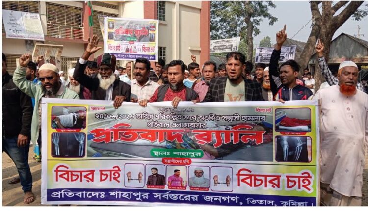 কুমিল্লার তিতাসের মজিদপুর ইউনিয়নের শাহপুর গ্রামের শহিদুল্লাহর ছেলে মোহাম্মদ নুরে আলমকে হত্যার উদ্দেশ্যে হামলার ঘটনায় জড়িতদের দ্রুত গ্রেপ্তােরের দাবিতে মানববন্ধন কর্মসূচি পালন করেছে শাহপুর এলাকাবাসী।