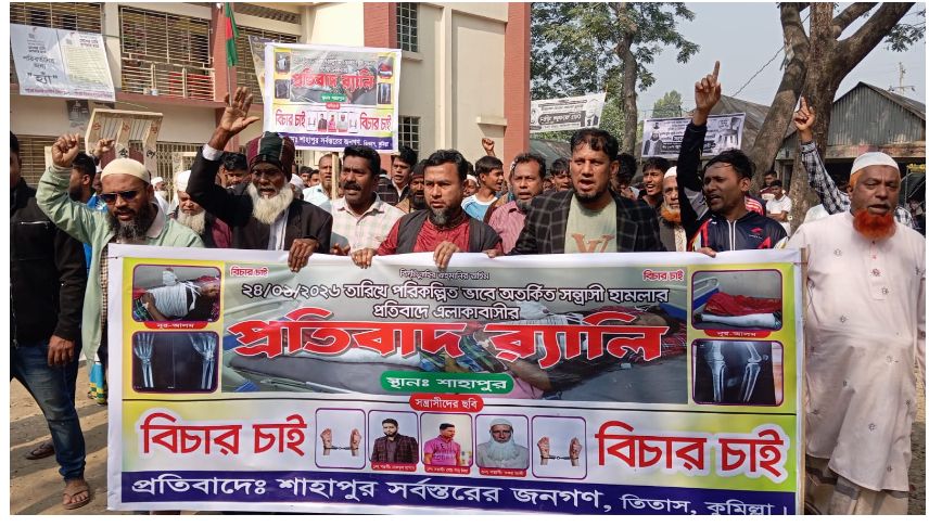 তিতাসে যুবককে হত্যার উদ্দেশ্যে হামলার ঘটনায় জড়িতদের দ্রুত গ্রেপ্তারের দাবিতে এলাকাবাসীর মানববন্ধন