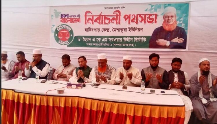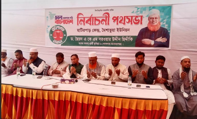 কুমিল্লার মনোহরগঞ্জ উপজেলার বিভিন্ন স্থানে দাড়ি পাল্লা প্রতীকের পক্ষে গণসংযোগ ও পথসভা করেছেন কুমিল্লা-৯ আসনে ১১দলীয় জোট মনোনীত প্রার্থী ড. একে এম ছৈয়দ সরওয়ার উদ্দিন সিদ্দিকী।