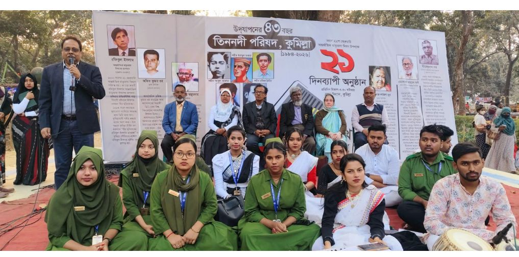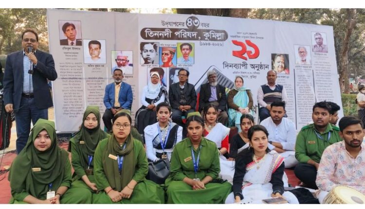 ধর্ম বর্ণ নির্বিশেষে বিশ্বের সকল ভাষাভাষি মানুষসহ বাংলা ভাষার মানুষের মাঝে এর ইতিহাস ঐতিহ্য রক্ষায় এই প্রজন্মকে অবহিত করার লক্ষ্যে তিন নদী পরিষদের উদযাপনের ৪৩তম বর্ষে এক আলোচনাসভা ও সাংস্কৃতিক অনুষ্ঠান অনুষ্ঠিত হয়েছে। শনিবার (৭ ফেব্রুয়ারী) বিকেলে কুমিল্লা নগর উদ্যানে মহান একুশে ফেব্রুয়ারী আন্তর্জাতিক মাতৃভাষা দিবস উপলক্ষে ২১দিনব্যাপী অনুষ্ঠান সূচীর ৭ম দিনে অধ্যাপক রাহুল তারণ পিন্টু এর সঞ্চালনায় প্রধান অতিথির বক্তব্য রাখেন- হার্ট কেয়ার ফাউন্ডেশনের কুমিল্লার প্রতিষ্ঠাতা ও সভাপতি ডাঃ তৃপ্তিশ চন্দ্র ঘোষ এবং বিশেষ অতিথির বক্তব্য রাখেন- কুমিল্লা ডায়াবেটিক এসোসিয়েশন নার্সিং ইনস্টিটিউটের অধ্যক্ষ শাহানারা আক্তার শানু এবং স্বাগত বক্তব্য রাখেন- কুমিল্লা আদালত অঙ্গনের পরিচিত মুখ এডভোকেট ও সাংবাদিক তাপস চন্দ্র সরকার, সাংস্কৃতিক সংগঠক কামাল হোসেন ও শ্যামল বড়ুয়া ববি প্রমুখ।
