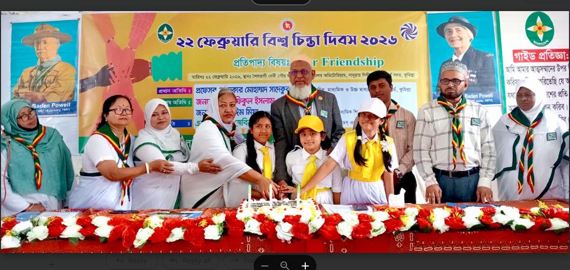 সিটিভি নিউজ।। বাংলাদেশ গার্ল গাইডস এসোসিয়েশন কুমিল্লা অঞ্চল এর আয়োজনে ৱোববাৱ শৈলরানী দেবী পৌর বালিকা উচ্চ বিদ্যালয়েৱ অডিটোরিয়ামে Our Friendship” এই প্রতিপাদ্যকে সামনে রেখে বিশ্ব চিন্তা দিবস ২০২৬ উদযাপন করা হয়। অনুষ্ঠানে প্রধান অতিথি ছিলেন মাধ্যমিক ও উচ্চ মাধ্যমিক শিক্ষা বোর্ড কুমিল্লাৱ সচিব প্রফেসর খোন্দকার মোহাম্মদ সাদেকুর রহমান, বিশেষ অতিথি ছিলেন জেলা শিক্ষা অফিসেৱ গবেষণা কর্মকর্তা মুহাম্মদ কাওছারুল ইসলাম, এবং সহকারী ক্রীড়া অফিসার মোঃ সাজ্জাদ মিয়া। অনুষ্ঠানে সভাপতিত্ব করেন বাংলাদেশ গার্ল গাইডস এসোসিয়েশন, কুমিল্লা অঞ্চলেৱ আঞ্চলিক কমিশনার (চঃ দাঃ) এড. ফাহমিদা জেবিন ।উক্ত অনুষ্ঠানে হলদে পাখি, গাইড, রেঞ্জার, গাইডার, স্থানীয় ও জেলা কমিটির সদস্য ও অত্র বিদ্যালয়ের প্রধান শিক্ষক ইয়াসমিন বেগম এবং আঞ্চলিক কার্যনির্বাহী কমিটির সদস্যসহ সর্বমোট ২৫০ জন অংশগ্রহণ করেন। সংবাদ প্রকাশঃ ২৩-০২-২০২৬ ইং সিটিভি নিউজ এর (সংবাদটি গুরুত্বপূর্ণ মনে হলে দয়া করে ফেসবুকে লাইক বা শেয়ার করুন) (If you think the news is important, please share it on Facebook or the like> See More =আরো বিস্তারিত জানতে কমেন্টসে লিংকে ছবিতে ক্লিক করুন= ==আরো =বিস্তারিত জানতে কমেন্টসে নিউজ লিংকে ক্লিক করুন=