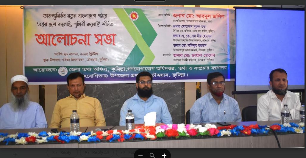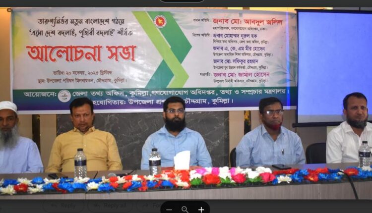 সিটিভি নিউজ।। প্রেস বিজ্ঞপ্তি।। কুমিল্লা, ২০ নভেম্বর’ ২০২৫===========জেলা তথ্য অফিস, কুমিল্লার আয়োজনে চৌদ্দগ্রাম উপজেলা পরিষদ মিলনায়তনে তারণ্যনির্ভর নতুন বাংলাদেশ গঠনে ‘এসো দেশ বদলাই, পৃথিবী বদলাই’ শীর্ষক আলোচনা সভা অনুষ্ঠিত হয়।