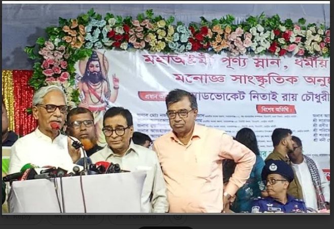 বুধবার (২৫ মাচ) রাতে নারায়ণগঞ্জের বন্দরের লাঙ্গলবন্দে মহাষ্টমী পুণ্যস্নান উপলক্ষে আয়োজিত ধর্মীয় আলোচনা সভা ও মনোজ্ঞ সাংস্কৃতিক অনুষ্ঠানে প্রধান অতিথির বক্তব্যে তিনি বলেন, জাতি-ধর্ম-বর্ণ নির্বিশেষে আমরা সবাই বাংলাদেশি। এখানে হিন্দু, মুসলমান, বৌদ্ধ, খ্রিস্টান সবাই মিলে আমাদের এই দেশ। আমাদের রয়েছে বৈচিত্র্যময় সংস্কৃতি, আর এই বৈচিত্র্যের মধ্যেই আমরা ঐক্য খুঁজি।