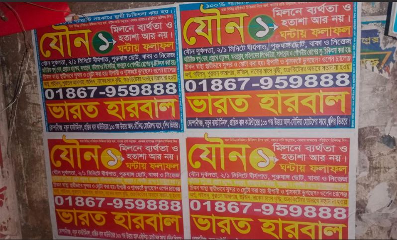 স্থানীয়রা বলছেন, এসব পোস্টার শুধু অশালীনই নয়, অনেক ক্ষেত্রে ভুয়া ও বিভ্রান্তিকর চিকিৎসার প্রতিশ্রুতি দিয়ে সাধারণ মানুষকে প্রতারিত করার আশঙ্কাও রয়েছে।